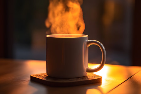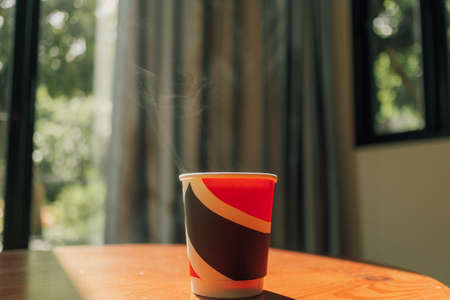 Hot cup of drink on the table in sun light of calm and warm morning.