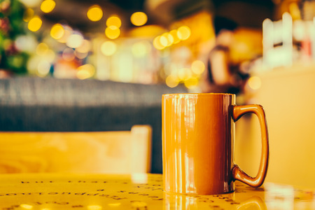 Coffee cup with steam on wooden table in coffee shop - vintage effect