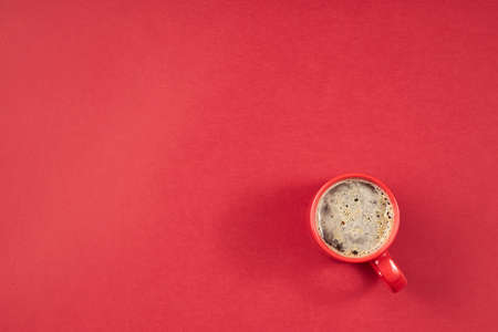 Red cup of coffee with a white cap on a black background. Hot drink with steam. Recycled and recyclable coffee paper cup. Copy space and horizontal orientation.