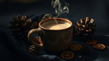 Cup of hot coffee with Christmas decoration on dark background, copy space