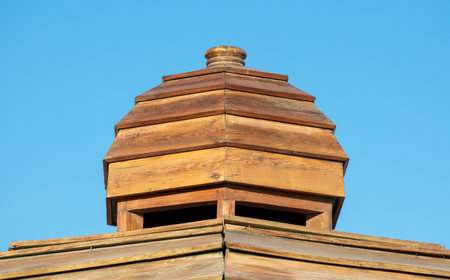 Soft sunlight streams through a circular opening in a unique wooden dome. The intricate lattice design above creates a warm and inviting atmosphere, perfect for relaxation and reflection.