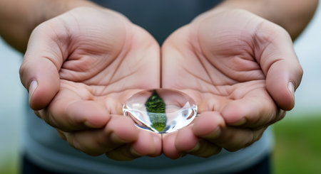 Serene image of a woman's hands cradling a clear glass bowl with a single water drop, conveying themes of purity, cleanliness, and tranquility.