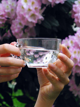 A glass cup with tea and flower petals in the palms. Tea ceremony.