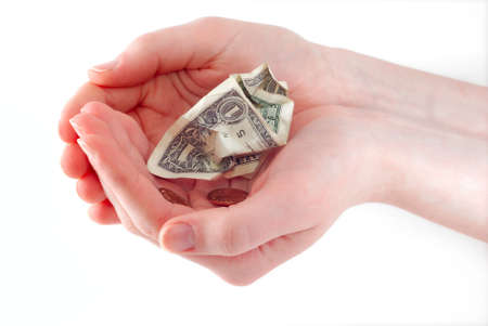Top view of female hands on various dollar background. Wealth concept with empty space for your design. Begging money concept.