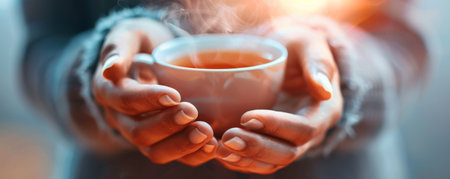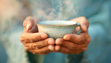 Aged hands gently cradle a steaming cup of coffee, highlighting warmth and comfort in a chilly outdoor environment, creating a serene and inviting atmosphere