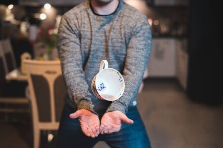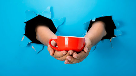 A human hand is holding a cup through ripped paper. Hand gestures. Mockup or Copy space