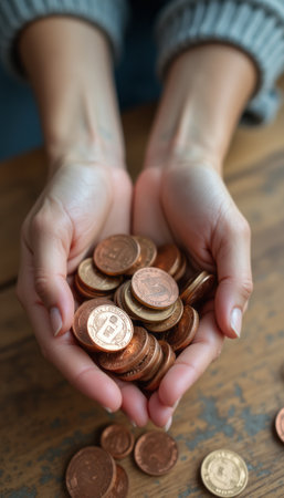 Two delicate hands gently hold a generous collection of gleaming coins, symbolizing wealth and prosperity. The warm wooden surface beneath adds a rustic charm, enhancing the feeling of abundance and financial security.