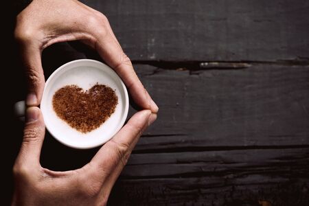 high angle view of a young man forming a heart with his hands around a cup of cappuccino with a heart drawn with cocoa powder on its milk foam, on a wooden table with a blank space on the right