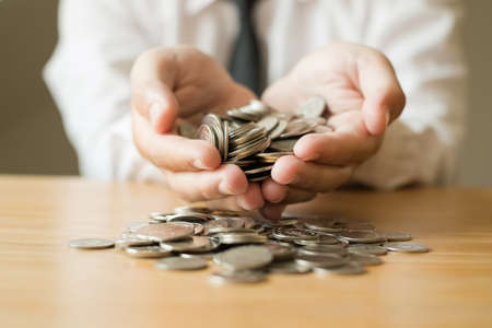 The coin on the hand of a businessman, Save money with coins, step into a successful growing business and save for retirement. Retirement Savings concept.