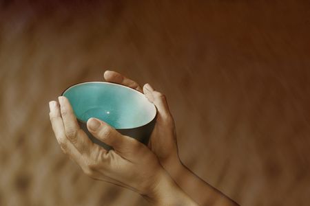 A small, dark gray stone bowl with a textured surface is held gently in open hands. The bowl appears to contain a liquid.