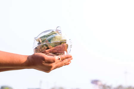 The hand holds the piggy bank, inside there are many Thai banknotes and coins, Money saving ideas