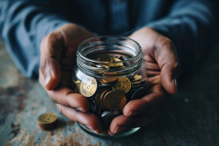 Man's hands holding coins in glass jar Saving money concept AI generated