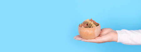 Two women's hands are folded in a boat asking for alms. Selective focus. Close-up