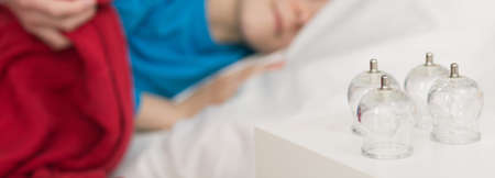 Glass cups for a cupping therapy, in the background boy lying in bed