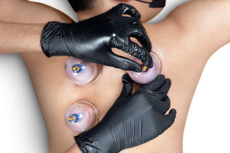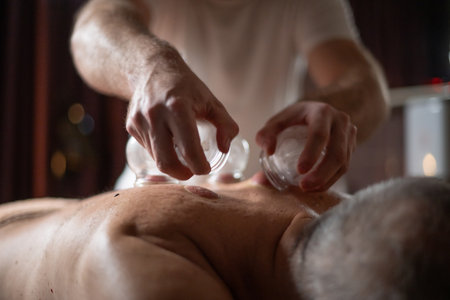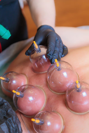 Close up of therapist applying cupping therapy on male clients back during wellness and rehabilitation treatment, traditional alternative medicine for relaxation and pain relief.