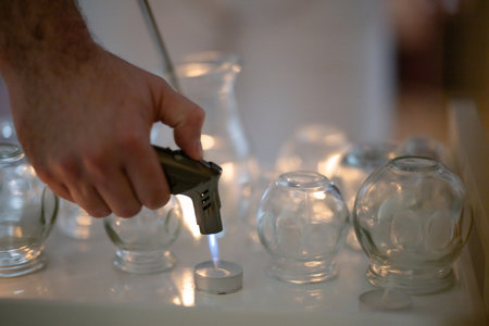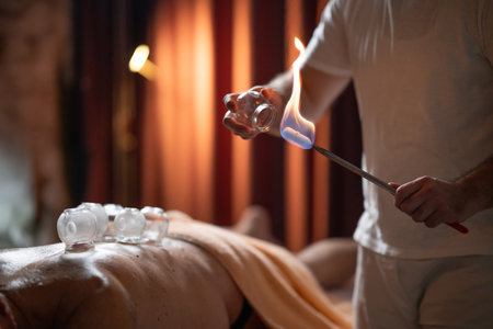 Close up of a traditional fire cupping therapy session with glass cups placed on a patients back and therapist using fire to create suction, promoting relaxation and healing.