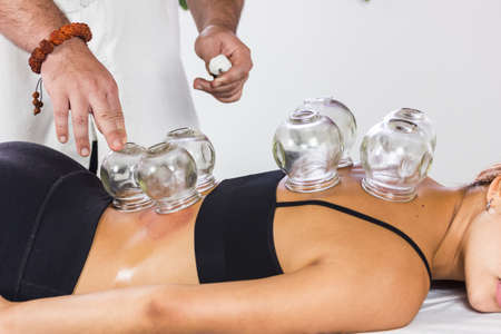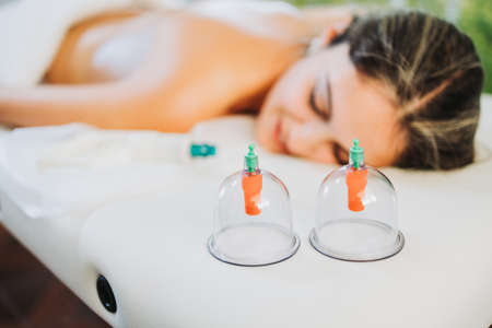 Suction cups placed beside of a female patient, by a massage therapist. Medical spa massage center.