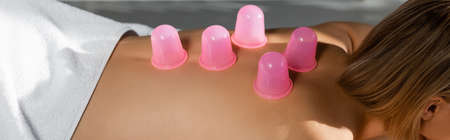 cropped view of young woman with pink massage cups on back receiving vacuum massage, banner