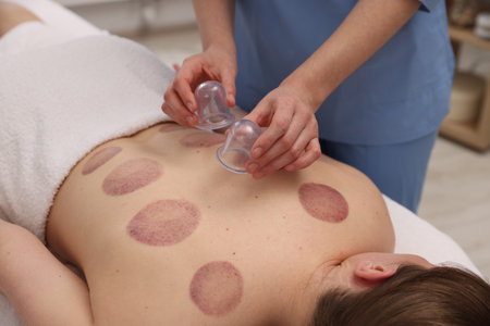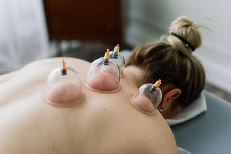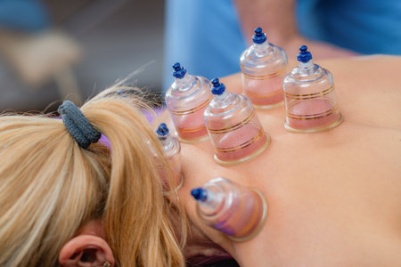 professional female specialist is doing cupping therapy on the back of beautiful caucasian lady