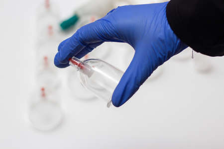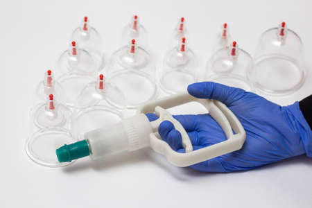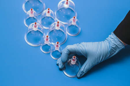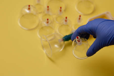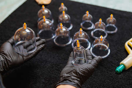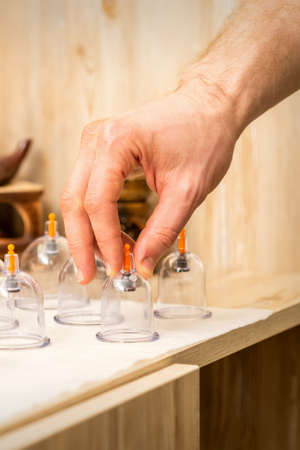 Hand takes vacuum massage glass jar from medical set of traditional Chinese cupping therapy. Cupping Therapy Set.