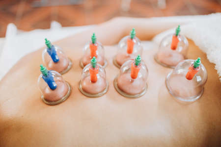 Suction cups placed on a female patients back, by a massage therapist. Medical spa massage center.