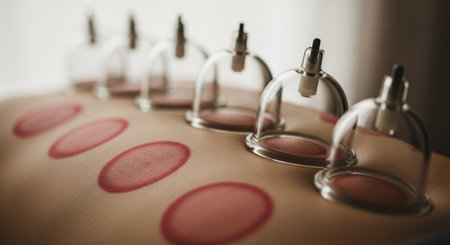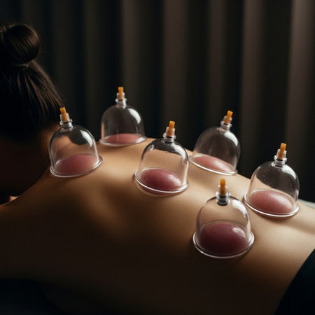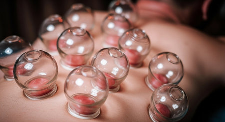 A therapist applies glass cups to a patient's back during a cupping therapy session. This ancient technique promotes healing, relaxation, and improves circulation.generative ai