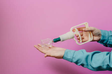 female hand with French manicure in medicine glove holds blue cosmetic medical jar for vacuum facial massage on pink background