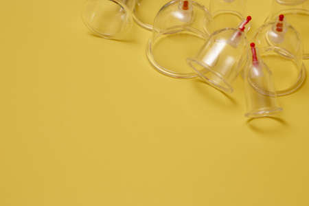 Jars for hijama. Vacuum pumps on a yellow background