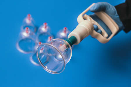 Jars for hijama. Vacuum pumps on a blue background