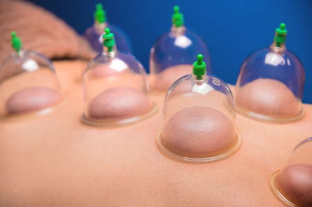Man lying down recovering health with vacuum cups. Close-up of vacuum cups on the back of a man against a black-blue background. Traditional oriental medicine.