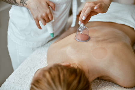 Alternative medicine health care. Fire cupping procedure, woman receiving vacuum cupping massage treatment, detail on female back.