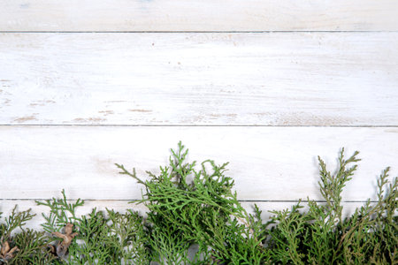Background of thuja branches. Natural wallpaper. Natural backdrop for your design. Flat lay. Copy space.