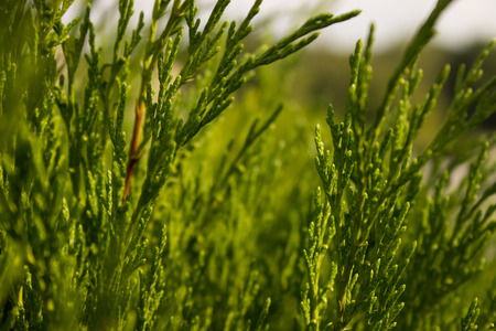 Close up top view of thuja branches. Selective focus. Abstract background.