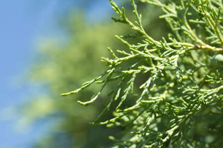 Neutral green foliage on branches of thuja western. Selective focus. Foliage on branches of thuja western as tecture.
