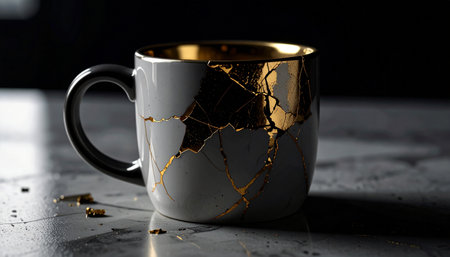Realistic white ceramic mug with broken parts repaired using gold kintsugi placed on marble surface, natural light, concept of resilience and healing