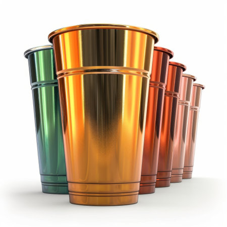 A vibrant arrangement of shiny metallic cups showcases various colors, perfect for parties and celebrations. Ideal for photography showcasing event themes and drink options.