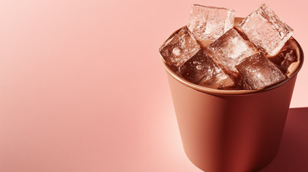 Refreshing drink served in a simple brown cup with ice cubes on a pastel background