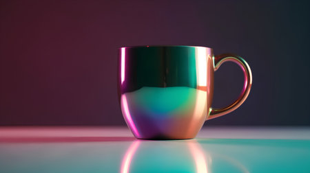 A metallic mug with a handle, showcasing vibrant iridescent colors of teal, pink, and purple with reflections on a dark surface.