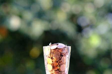 Coins in glass on bokeh background, save money for prepare in the future.