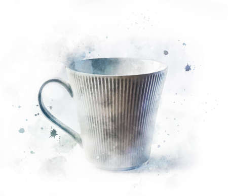 Watercolor white cup. Coffee or tea ceramic cup with light boho texture. Realistic painting with kitchen item isolated on white background.