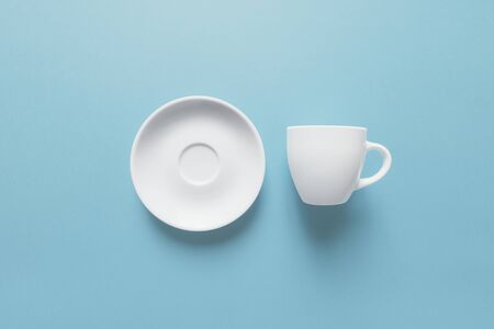 Coffee break, white cup and saucer isolated on light blue