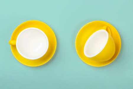 Top view on yellow cups and saucers on blue background