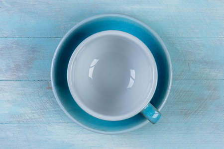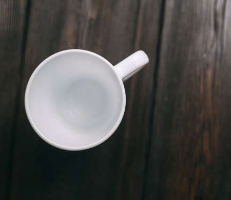 Empty porcelain coffee cup on wooden table top view
