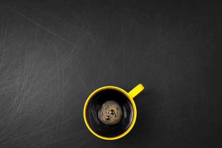 Clockwise stir. Yellow cup of black coffee flat lay on scratched rough black background. Copy space for your text, image or message. Minimal, top view, horizontal image style. Off-center composition.