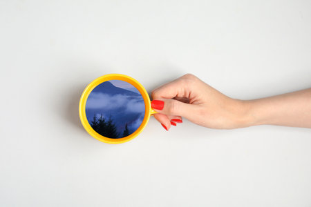 Woman holding cup with mountain landscape inside on white background, top view