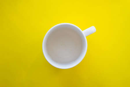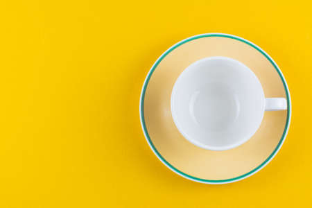Empty white coffee cup isolated on yellow background.