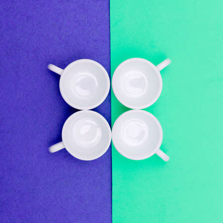 white coffee cup on blue and pink paper , minimal style background