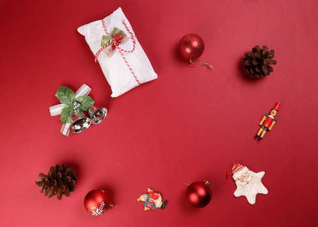A vibrant collection of Christmas-themed decorations and ornaments arranged on a red background, perfect for capturing the festive spirit and holiday joy.