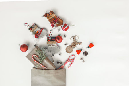 Season's greetings scene. Christmas decorations,gift boxes with red ribbons, Ñhristmas balls, rustic star, holly berries, frosty spruce branches, confetti on white backdrop, selective focus with blur