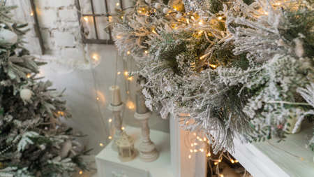 composition of Christmas decorations with fir tree and garlands. the sparkling lights